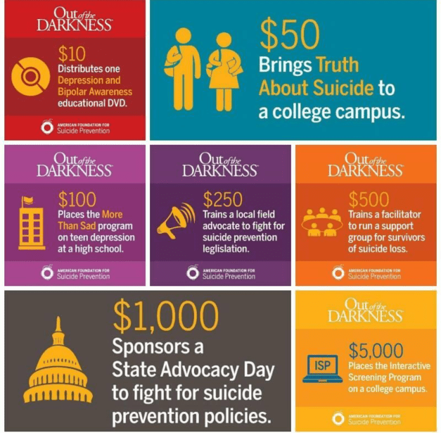 EVERY $50 – Provides AFSP educational materials to 25 people. If just one person seeks help after reading these materials, a life could be saved for less than the cost of dinner and a movie.